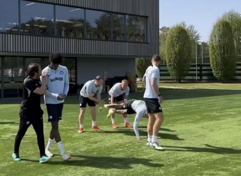 Siparietto da ridere oggi ad Appiano Gentile, prima dell’allenamento dell’Inter a due giorni dalla sfida di San Siro contro il Cagliari. Il profilo X del club mostra un video in cui Denzel Dumfries, entrando in campo, viene letteralmente buttato giù con uno scherzo da Carlos Augusto e Davide Frattesi. Il clima alla Pinetina è sempre più sereno, con lo scudetto ormai a un passo. Di seguito il video: