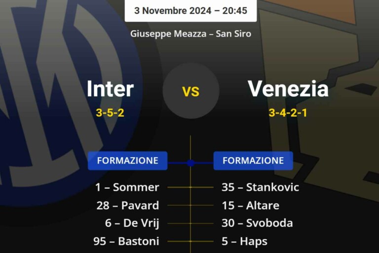 Dopo l’impegno di Empoli, l’Inter si prepara ad affrontare il Venezia in casa nella gara valida per l’11a giornata di Serie A. I nerazzurri recuperano finalmente per la panchina Francesco Acerbi e Hakan Calhanoglu, mentre Carlos Augusto si rivedrà solo dopo la sosta.