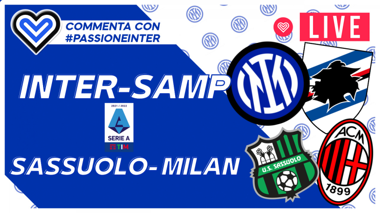 Commenta con noi Inter-Sampdoria e Sassuolo-Milan, 38a giornata di Serie A 2021/2022: seguiamo le formazioni ufficiali, il pre-partita, la diretta di Inter-Sampdoria e Sassuolo-Milan e commentiamo insieme le news di oggi.