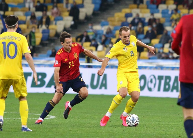 KYIV, UKRAINE - OCTOBER 13, 2020: Mikel Oyarzabal of Spain (L) fights for a ball with Yevhen Makarenko of Ukraine during their UEFA Nations League game at NSK Olimpiyskiy stadium. Ukraine won 1-0