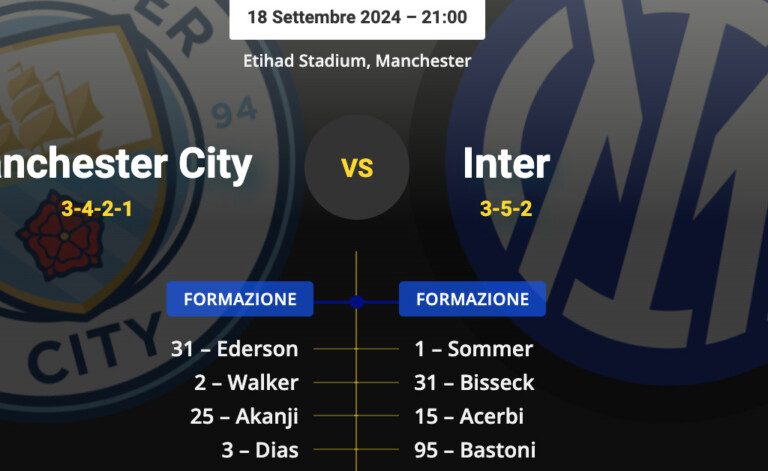 Di seguito le probabili formazioni di Manchester City-Inter: